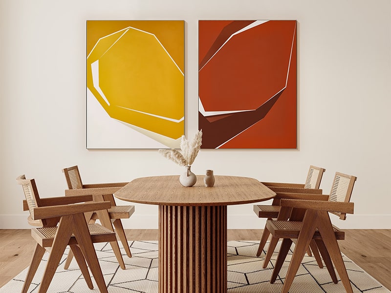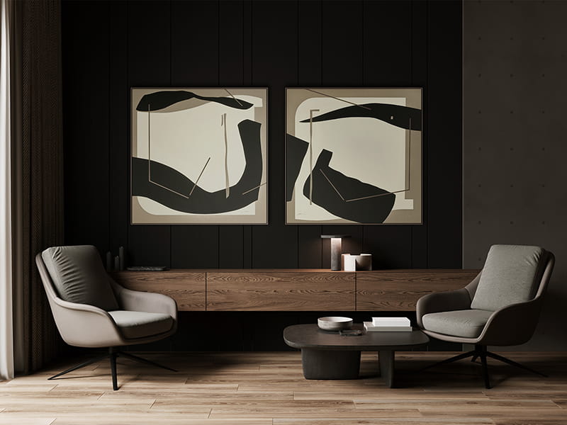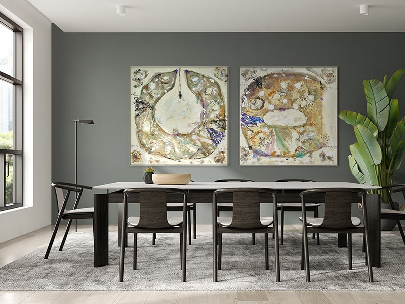 Parejas de obras enmarcadas con cristal en formato pequeño que dialogan con fuerza y equilibrio. Una mezcla de arte con reflejos sutiles que suman profundidad, elegancia y un atractivo juego de luz en la decoración.
